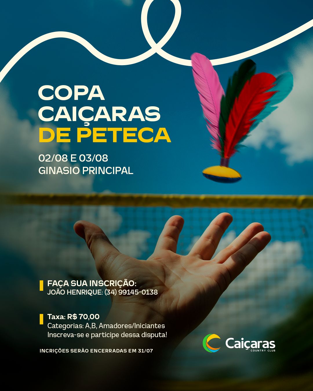 Copa Caiçaras de Peteca 2025 Onde: Ginásio Principal, Caiçaras Country Club Quando: 02 e 03 de agosto Inscrições: João Henrique (34) 99145-0138 Taxa: R$ 70,00 Prazo final de inscrição: 31 de julho