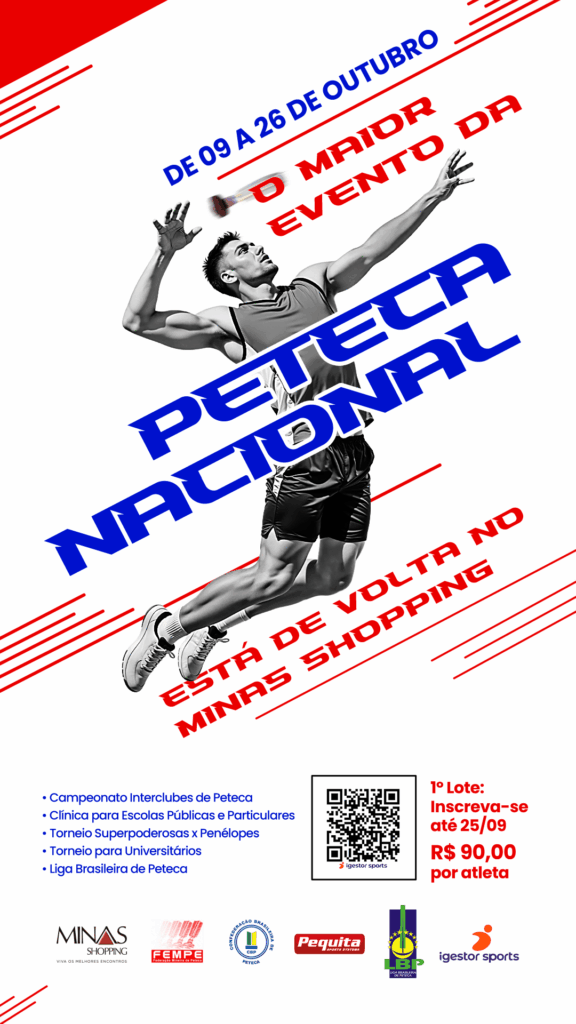 A Confederação Brasileira de Peteca (CBP) anuncia oficialmente o período e a programação do maior evento da peteca nacional, que será realizado de 09 a 26 de outubro de 2025, no Minas Shopping, em Belo Horizonte (MG).